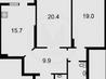 2 комнаты , площадь 66 / 32 / 20 , этаж 19
